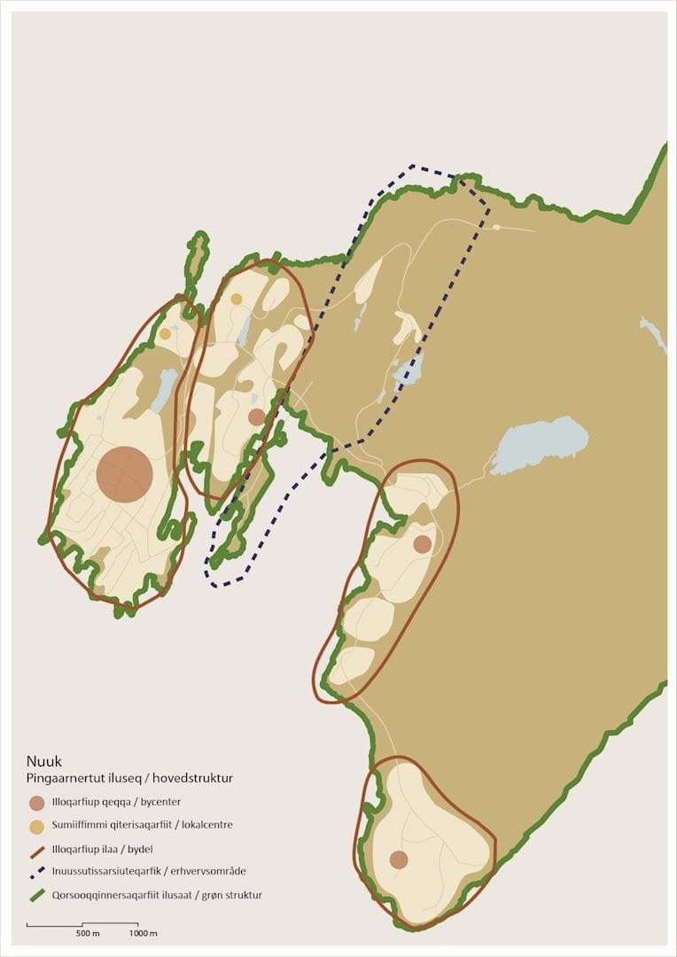 Nuuk er ubetinget hovedbyen i området, og byen skal videreudvikle sin rolle som hovedstad for landet og som hovedby for kommunen. Byen er et erhvervslokomotiv med en kraftig befolkningstilvækst, der skal håndteres på en bæredygtig måde. Samtidig er der og vil der i perioden blive truffet beslutninger om den nationale infrastruktur, der vil have afgørende betydning for byen. Det betyder, at den overordnede byudviklingsstrategi er robust og formuleret med det formål at håndtere flere forskellige udviklingsmuligheder. Strategien er udmøntet i en række fokusområder i forhold til bosætning og erhvervsudvikling, der kan realiseres uafhængigt af de overordnede udviklingsmuligheder.