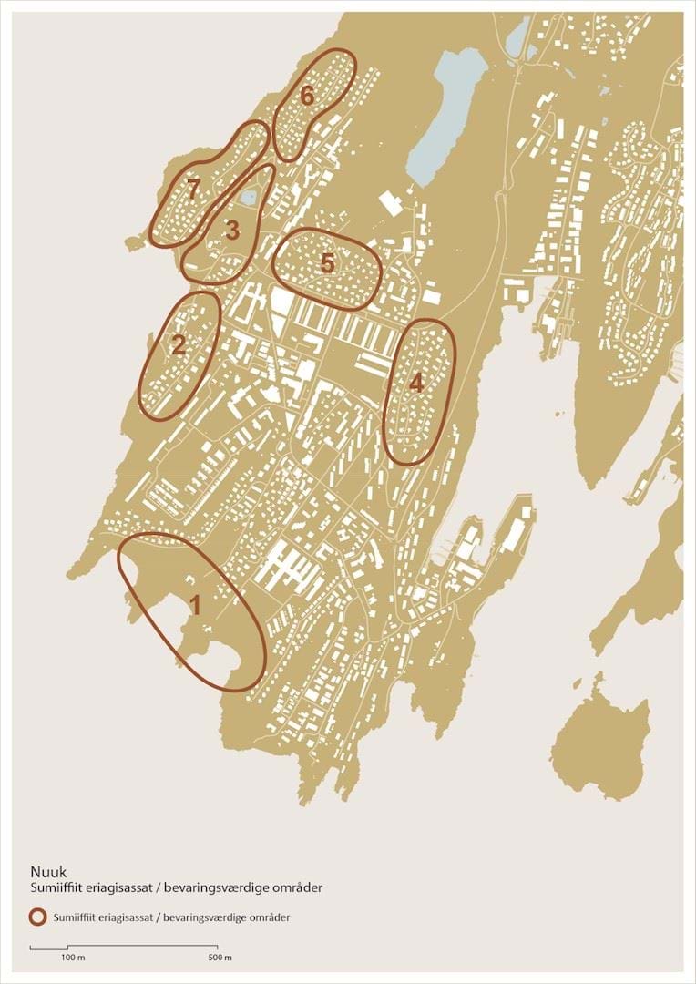Nuuk bydel rummer en række særligt bevaringsværdige områder (§ 2-områder - Grønlands Hjemmestyrets rapport "Nuuk - bevaringsværdige bygninger og bydele", 1990), hvoraf dele er fredede. Det betyder, at det skal sikres, at områdernes historisk værdifulde miljø med eksisterende bygninger, terræn osv. skal bevares for fremtiden. Det drejer sig om Herrnhut-området (1), Kolonihavnen (2) og Aqqaluks Plads (3).