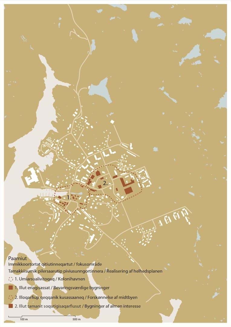 Det samlede område er kendetegnet ved forholdsvis store åbne arealer med meget restrummelighed. Fokus vil fortsat være at forstærke midtbyen og skabe en større sammenhæng i oplevelsen af byen og særligt mellem de eksisterende byrum, der kan og skal danne ramme om lokalt forankrede initiativer og aktiviteter. Arbejdet vil fokusere på at forbedre udearealerne og styrke forbindelserne igennem området. Ambitionen er at bygge videre på de faciliteter, der allerede findes i byen, og at de skal forstærkes og fornyes i det omfang, der kan bidrage til at Paamiut fortsat kan være et godt sted at bo.