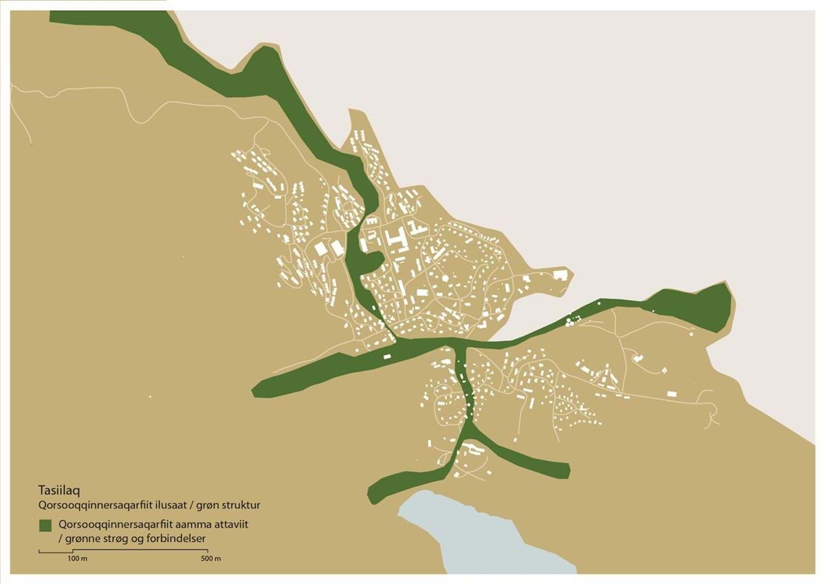 Det er vigtigt, at der udarbejdes en samlet rekreativ plan for byen, så dens udvidelse ikke fører til en mindsket kvalitet i byens friholdte områder. Planen skal udarbejdes med udgangspunkt i de tre grønne strøg, der er vist på kortet, hvor et hovedstrøg, Blomsterdalen, deler byen i to, og hvor henholdsvis en ny hundeplads mod nord og en eksisterende festplads mod syd danner udgangspunktet for visuelle og fysiske forbindelser langs kysterne. Samtidig kan den grønne struktur være med til at understøtte rekreative forbindelser til byens centerområder.
